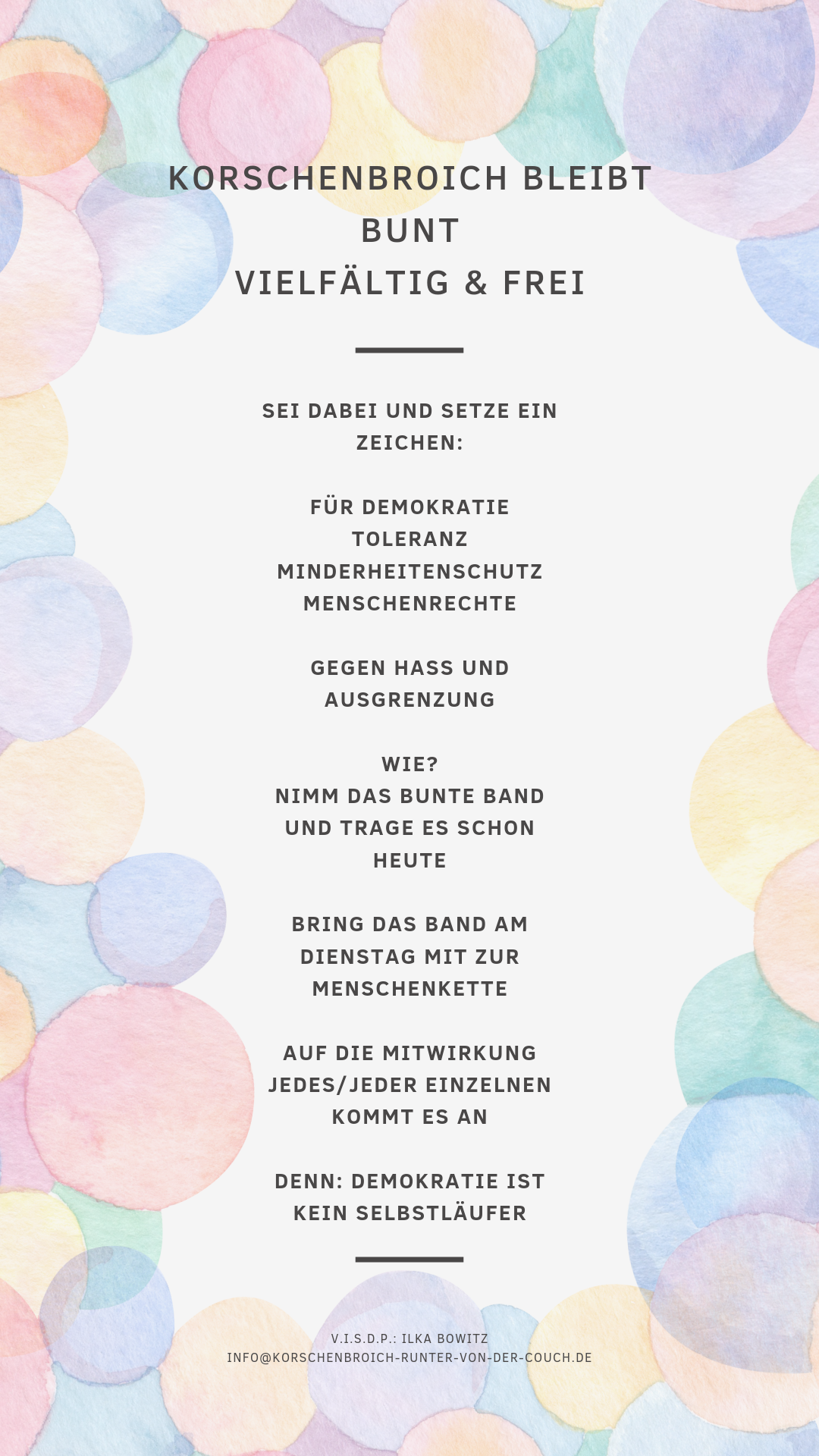 Demokratie ist noch immer kein Selbstläufer, darum planen wir eine Menschenkette unter dem Motto „Korschenbroich bleibt bunt.“ Dafür suchen wir noch Unterstützung. Geplant ist eine vielfarbige Kette um Kirche und Rathaus zum Beispiel mit bunten Bändern, Kreide und Seifenblasen, und zwar am Dienstag, 23.4.2024 um 17.30 Uhr.